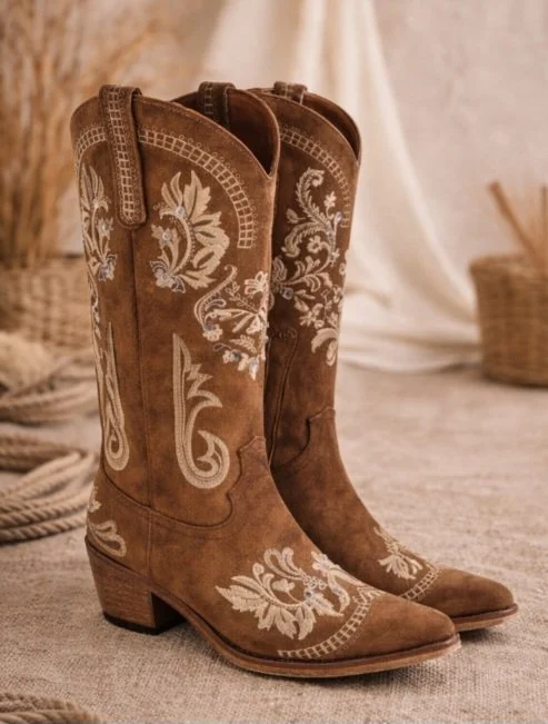 Step into effortless western elegance with our Embroidered Brown Western Boots — where timeless style meets intricate detail. Designed with rich, warm tones and delicate cream embroidery, these boots bring a soft, feminine twist to a classic silhouette.